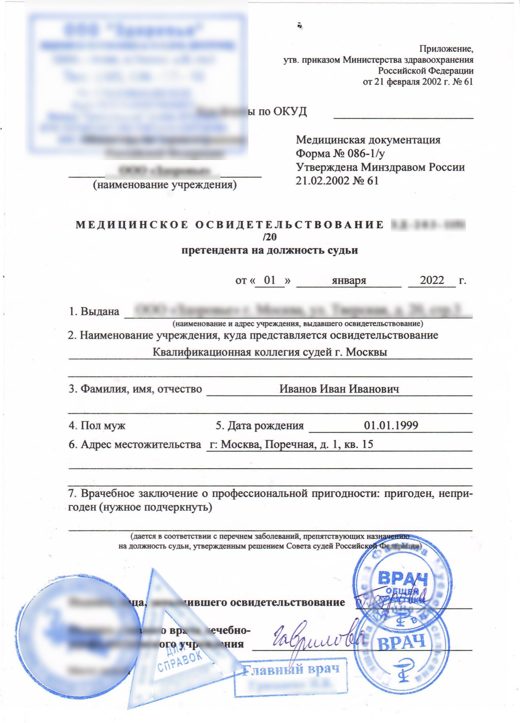 Чтобы вступить в должность судьи, претендент должен пройти медицинское освидетельствование. Его результаты фиксируются в справке по форме 086-1/у. Процедура оформления предусматривает медкомиссию и сдачу анализов.