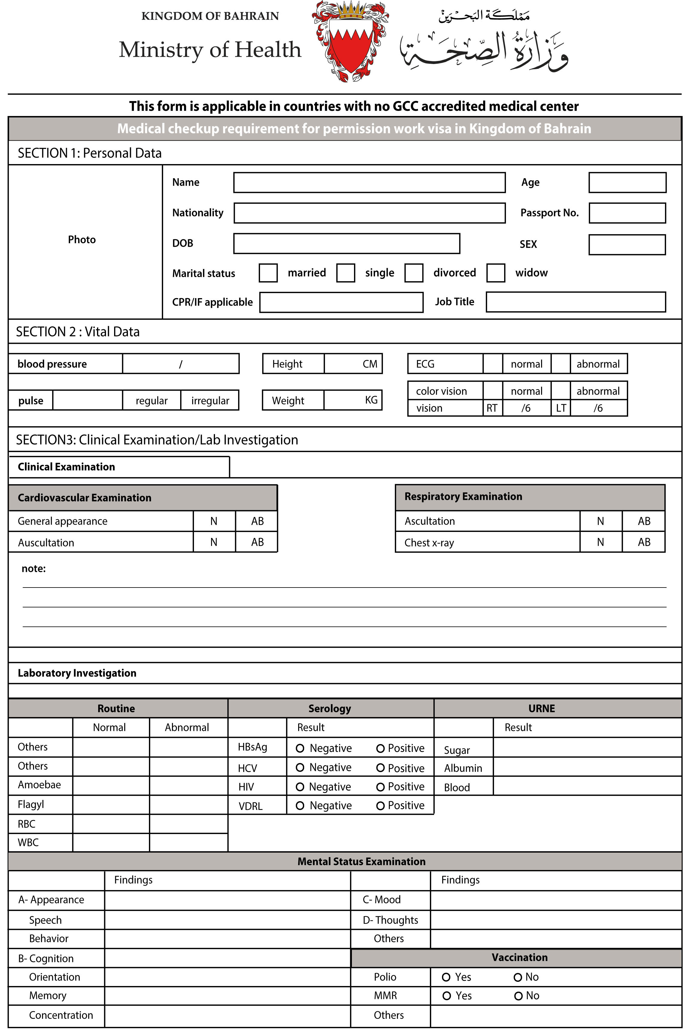 Медицинское обследование перед приемом на работу в Бахрейн (Medical checkup requirement for permission work visa in Kingdom of Bahrain) – это медицинское обследование (чек-ап), который необходимо пройти для получения рабочей визы в Бахрейн. Данный медицинский сертификат будет свидетельствовать о том, что пациент подходит или не подходит для должности, на которую он претендует.Если Вам необходимо оформить Check up организма на иностранном языке (Non_GAMCA_Medical_Check_Up_Form) для Бахрейна, обращайтесь в нашу клинику «Лира» в Москве. Хотим обратить Ваше внимание, что наш медцентр работает по лицензии. Мы можем предоставить перевод нашей лицензии на английский язык.