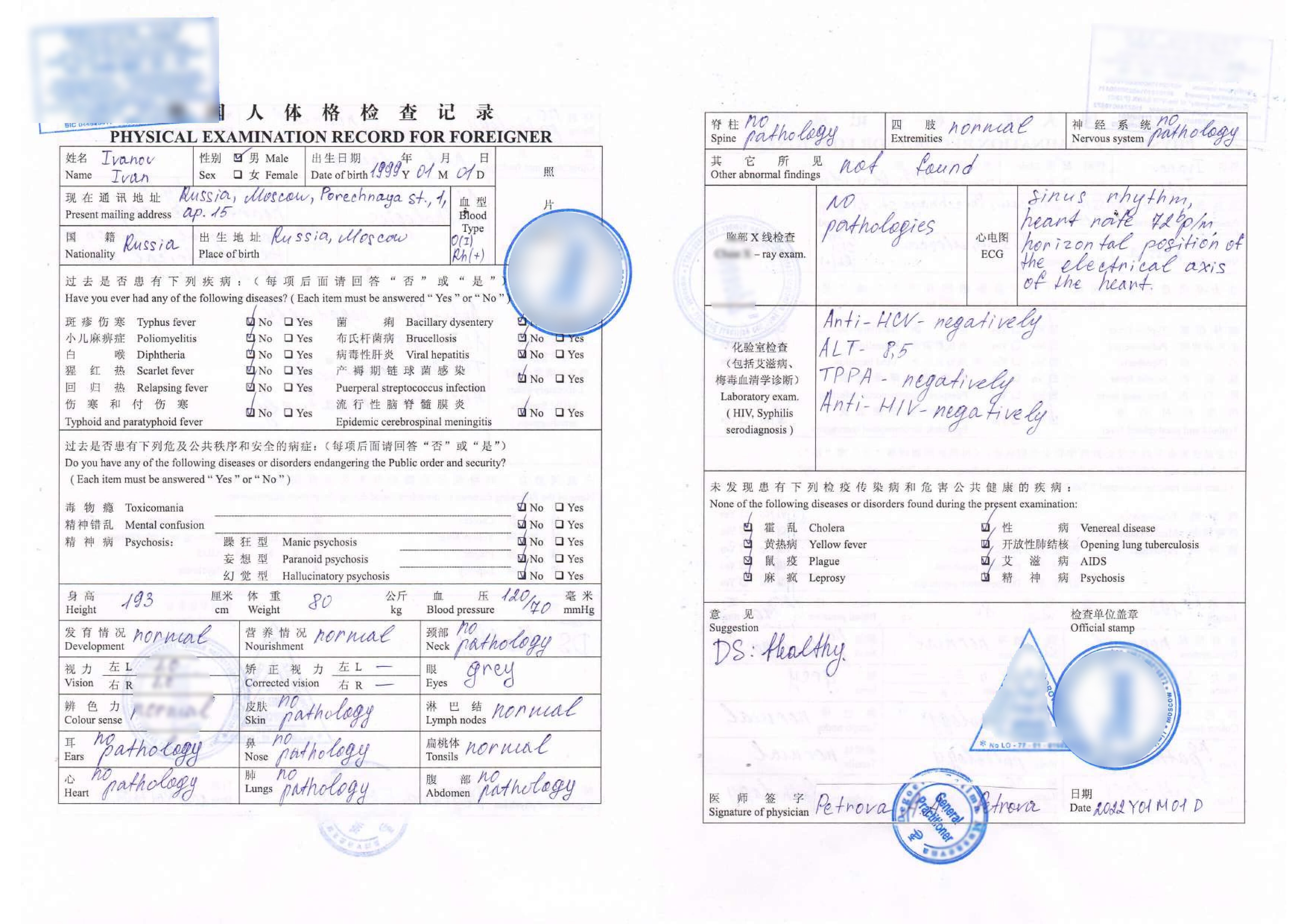 Все врачебные осмотры занимают около 40 минут. Справка будет готова через день. При необходимости за дополнительную оплату результаты анализов могут быть получены в течение 1 часа, и документ выдается практически сразу, в день обращения.Цена Physical Examination Record for Foreigner