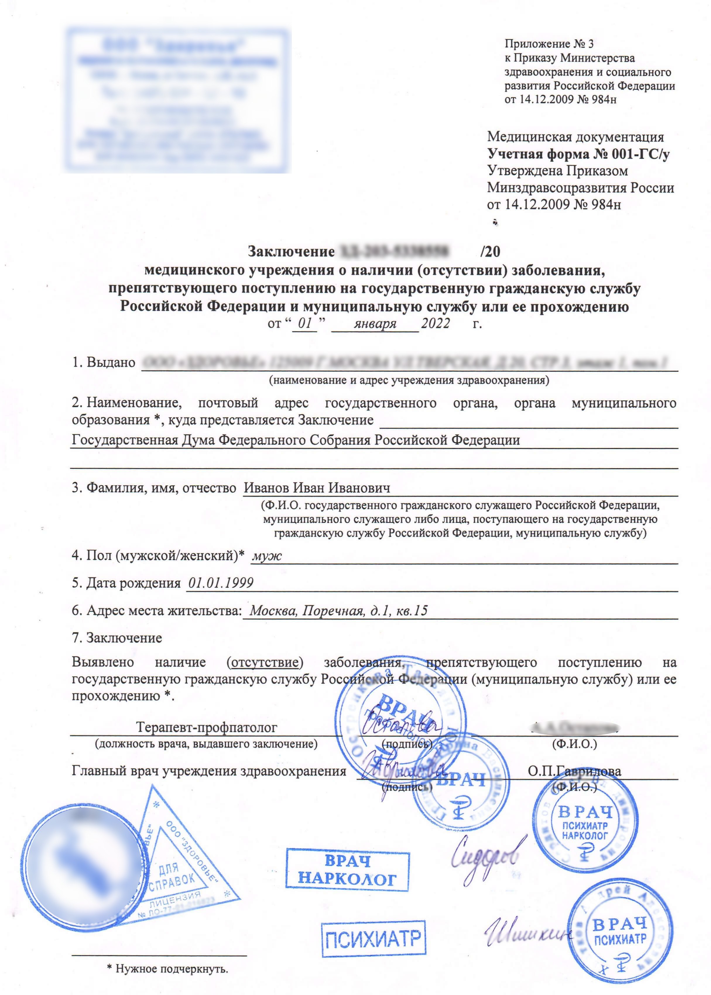Медицинская комиссия на справку для гос служащих ГСУ-001 с психиатром и наркологом