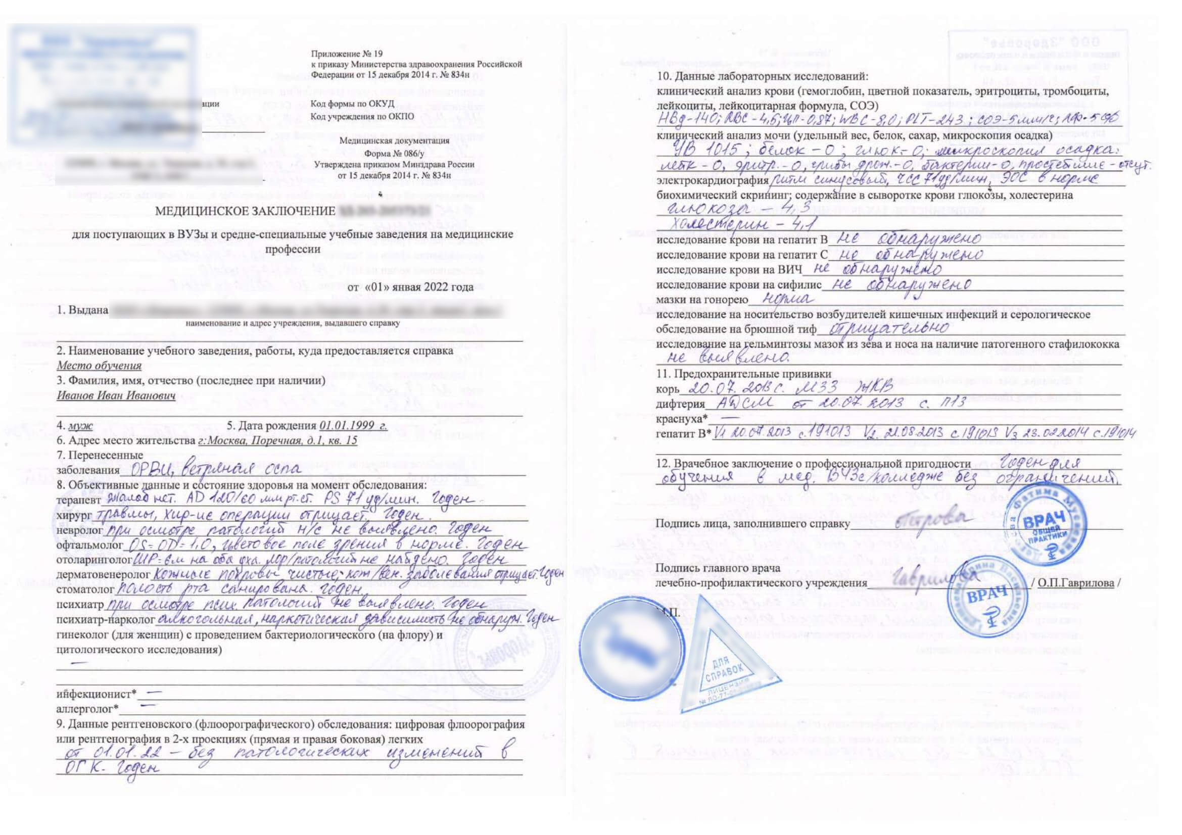 Мы не рекомендуем покупать этот документ у тех, кто предлагает заключение врачей без прохождения комиссии. Такие действия находятся вне правового поля, влекут исключение из вуза, увольнение с работы, прочие неприятности. В нашем центре вы пройдете всех специалистов за 1-2 дня, сможете сдать необходимый документ в приемную комиссию или отдел кадров без промедления.