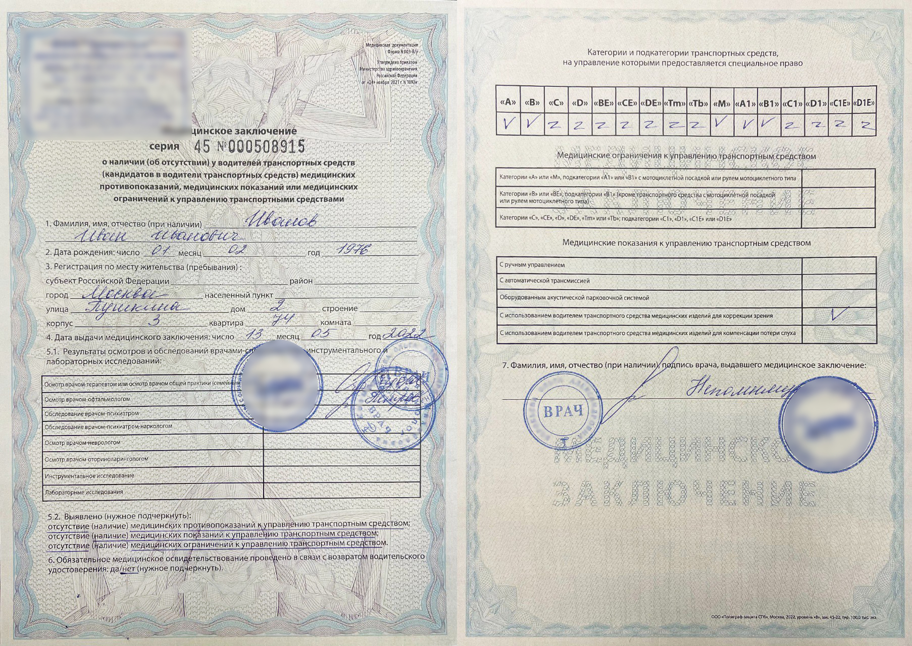 1. После того, как мы вас зарегистрируем в электронной базе, вам будет выдан бланк 003 ву установленного образца. После успешного прохождения осмотров офтальмолога и терапевта, отметки этих специалистов будут внесены в вашу справку. В бланке нового образца, который используется в 2023 году, есть строчки для отметок психиатра и нарколога. Важно понимать, что для того чтобы в автошколе/Гаи/МФЦ приняли вашу справку, печати этих специалистов нужно получить государственные- именно в диспансерах по месту жительства.
